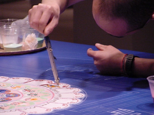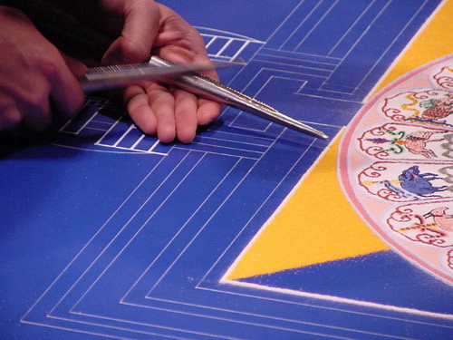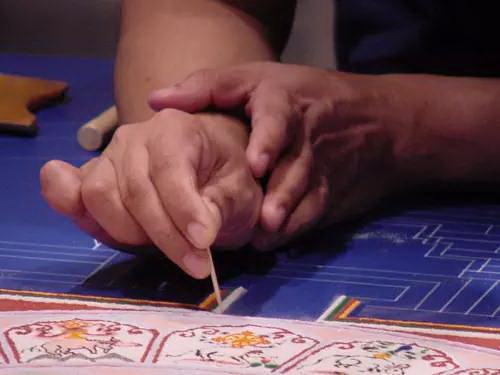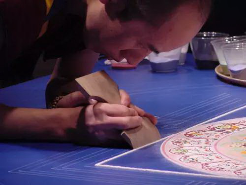 绘制沙子是一个艰辛而细致的过程,喇嘛把事先磨成小颗粒状的沙子装在特制的锥形容器里,通过或轻或重的敲打控制流量,将沙子漏在模板上,细细堆砌、勾勒,而且要全神贯注、一丝不苟,稍有不慎,就要前功尽弃。