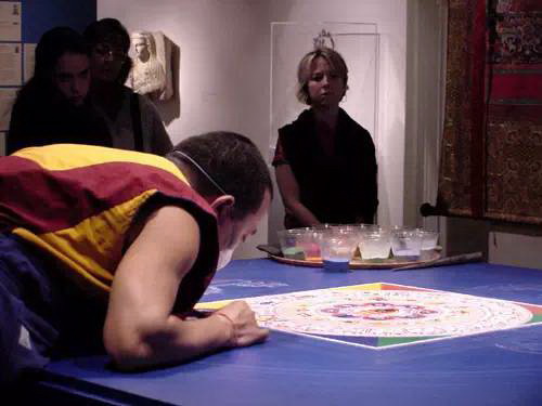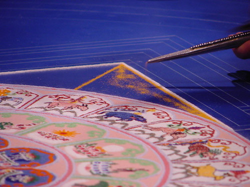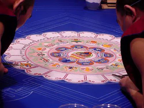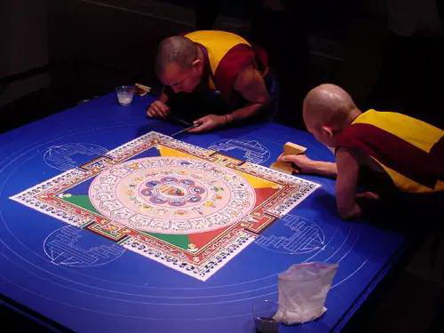 在藏传佛教中有一种最独特也最精致的宗教艺术。每逢大型法事活动,寺院中的喇嘛们用数百万计的沙粒描绘出奇异的佛国世界,这个过程可能持续数日乃至数月。这就是奇妙的坛城沙画,在藏语中叫做的dul-tson-kyil-khor,意思是“彩粉之曼陀罗”。据传从两千五百多年前,佛陀亲自教导弟子制作沙坛城开始,这门精致绝伦的宗教艺术,就历代相承毫无间断。而在十一世纪,由印度北传到西藏,保存至今。
