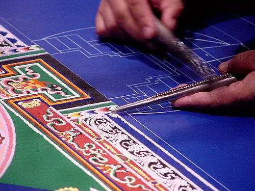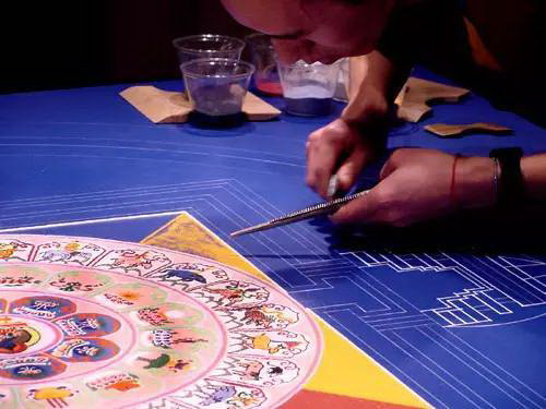 多数坛城沙画是用七彩的沙子或岩石粉末、谷物这些非永久的材料用手工的多种工艺精制而成,过程有严格的规定和细节要求,结构、位置、长度、名字等关键的地方绝不能搞错,一般都是由经过训练的僧人执行,当然它也不是一成不变的。