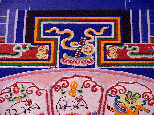 漫长的创作,成功后短暂的喜悦,然后是毫不犹豫的毁灭。当这个沙制的坛城在完成及法会过后。它将会被驱散。它是从外层的沙驱散向内层,代表一切老死后又回到它心中本初的状况。另外它又表达世事的无常和空性。
